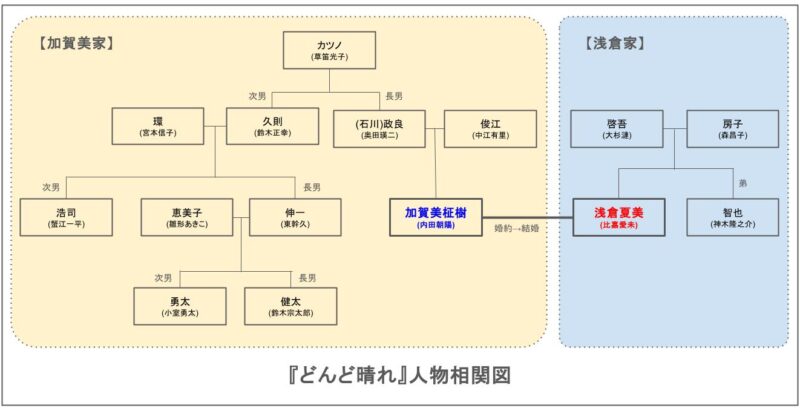 浅倉家と加賀美家の家族関係を中心にした人物相関図です。